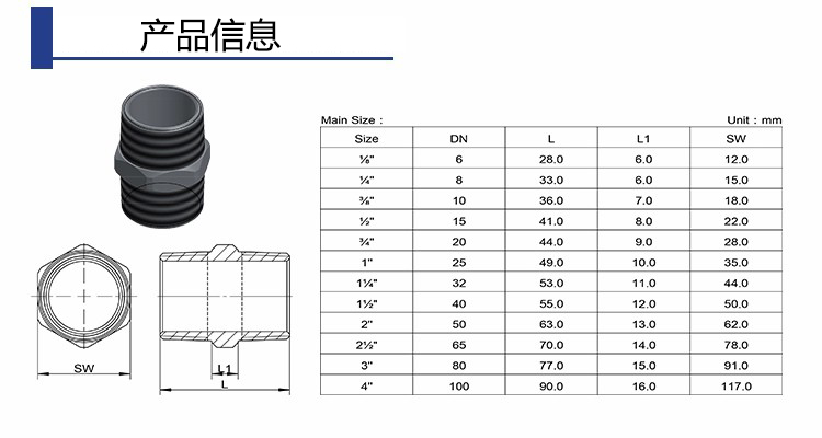 | 不鏽鋼六角(jiǎo)外絲接頭 | |